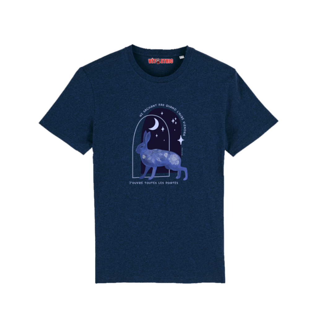 « Ne sachant pas quand l’aube viendra, j’ouvre toutes les portes » visuel Lapin couleur bleu nuit